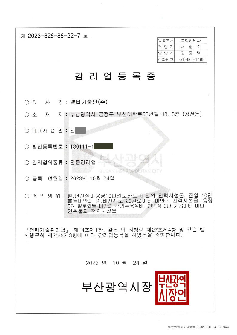 델타기술단 보유 등록증