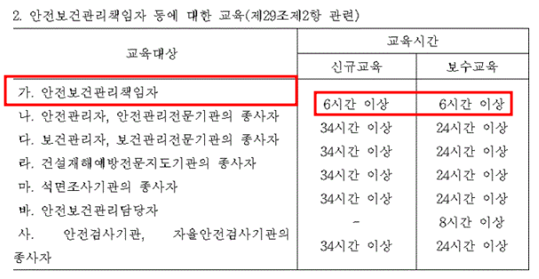 최초 선임일 경우 신규교육 6시간을, 선임이 되었을 경우 2년에 1회 6시간 보수교육을 실시해야하며 교육은 집체교육, 현장교육, 인터넷 원격교육, 비대면 실시간 교육으로 가능하나 총 교육시간의 2/3 이상을 집체교육 또는 현장교육으로 수강해야하므로 온라인 교육을 수강하고 싶더라도 최소 4시간은 오프라인 교육을 수강해야 함.