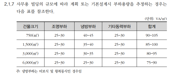 부하설비용량 추정시 전등/전열, 일반동력, 냉방동력으로 구분하자. 건축전기설비 설계규정(2016)의 부록에 의해