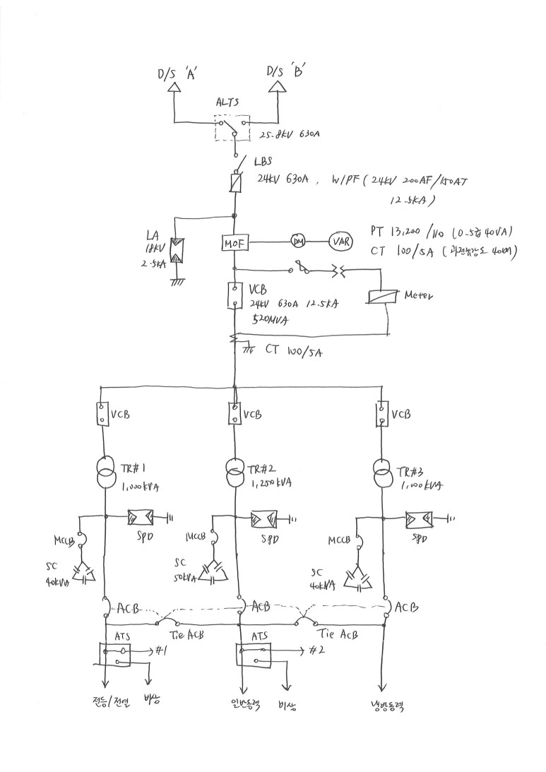 CB 1차측에 PT를, CB 2차측에 CT를 시설하는 경우로 설계하였다. 위에부터 살펴보면 ALTS의 경우 주,예비선로 자동절환으로 예비선 수전방식에 사용한다. LBS 부하개폐기는 한류퓨즈 내장형으로 한류퓨즈가 용단시 3상 동시개로되어 단락보호 및 결상방지 역할을 한다. 피뢰기는 뇌서지 방전을 통해 뇌서지 침입시 수전설비를 보호하는 역할을 한다. 전력퓨즈의 경우는 단락보호용이며, MOF는 일반적으로 옥내형은 몰드타입이다. VCB는 TR 1차측과 주인입점에 시설되어 회로를 보호하며 SA서지흡수기는 개폐서지와 같은 이상전압으로부터 회로를 보호하는 역할을 한다. 이는 VCB2차측에 설치되어 BIL이 낮은 변압기를 보호하는 역할을 한다. 일반적으로 VCB+MOLD TR에서 사용된다. 변압기는 옥내형은 요즘은 거진 몰드변압기를 사용하며 전력용콘덴서는 역률보상용으로 변압기용량 500~2000kVA 이하의 경우 4% 선정한다.
