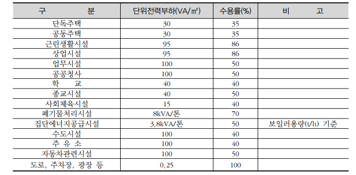 이중 주택,아파트의 경우는 단위면적당 40VA로 KEC에서 개정되었다. 또한, 각종 부하밀도는 아래를 참조한다.