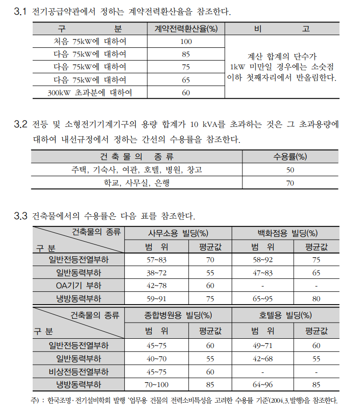 건축물 수용률은 참조하여 적용. 부등률은 아래를 참조한다.