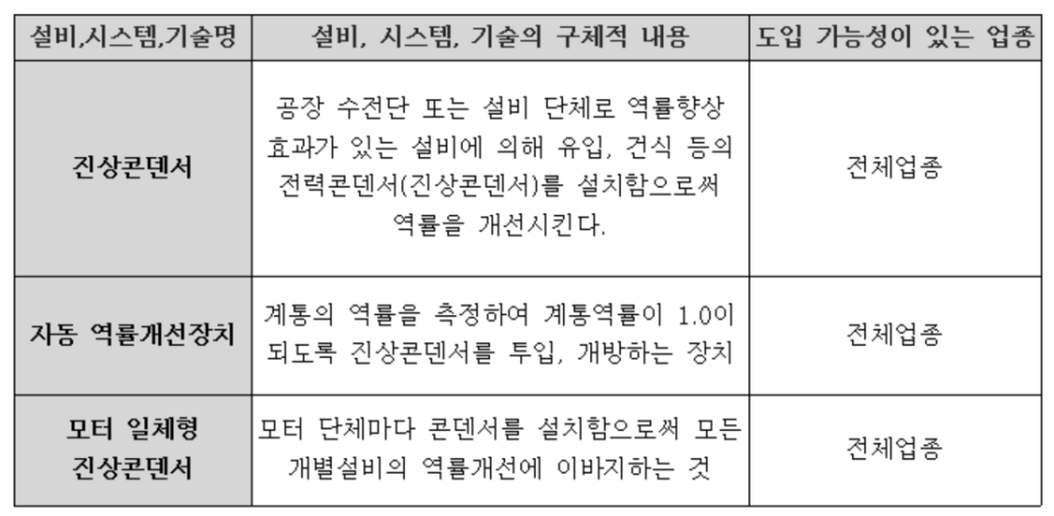 일본 경제산업성 고시에서 중장기 계획 책정에서 참조할 만한 지침이 공표되었는데, 역률개선으로서 표의 설비, 시스템, 기술명이 제시되어 있다. 이들의 특징과 주의점은 아래와 같다.