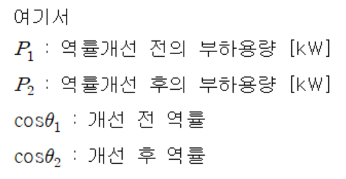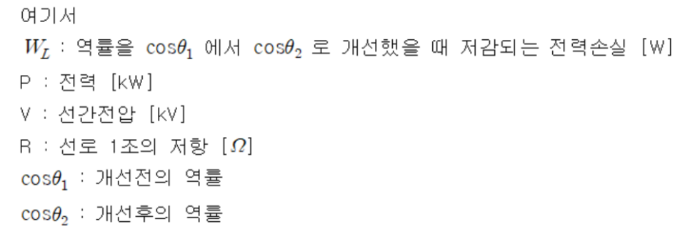 역률개선에 의해 선로전류가 감소하면 전선 내의 저항에 의한 선로손실이 저감되며, 저감되는 전력손실은 다음식으로 구해진다.