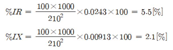 100kVA 변압기 2차측에 600V, CV3 심 100㎟ 케이블 100m를 거쳐 50kW, 역률 70%의 부하가 있다. 이 부하에 36kvar의 진상콘덴서를 설치해 역률을 95%로 개선한다. 변압기의 %IR 및 %IX는 %IR = 0.5% , %IX = 2.5% 로 한다. 케이블의 저항 및 리액턴스는